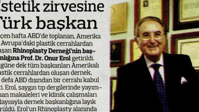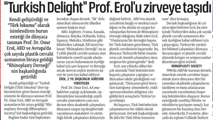 Kendi geliştirdiği ve ‘Turkish Delight’ (Türk lokumu) diye tıp literatürüne giren burun estetiği yöntemi ile dünyaca tanınan Prof. Dr. Onur Erol, ABD ve Avrupalı uzmanların bir araya geldiği ‘Rhinoplasty Derneği’nin (Rhinoplasty Society) başkanlığına getirildi.Bugüne kadar tüm başkanları Amerikalı plastik cerrahi uzmanlarından oluşan dernek, ilk defa Amerikalı olmayan bir ülkeden uzmanı başkanseçti.ABD, İngiltere, Fransa, Kanada, Almanya,…